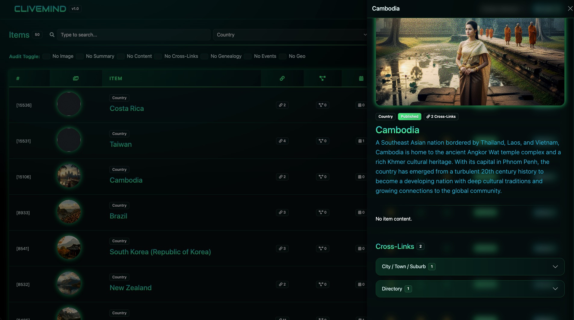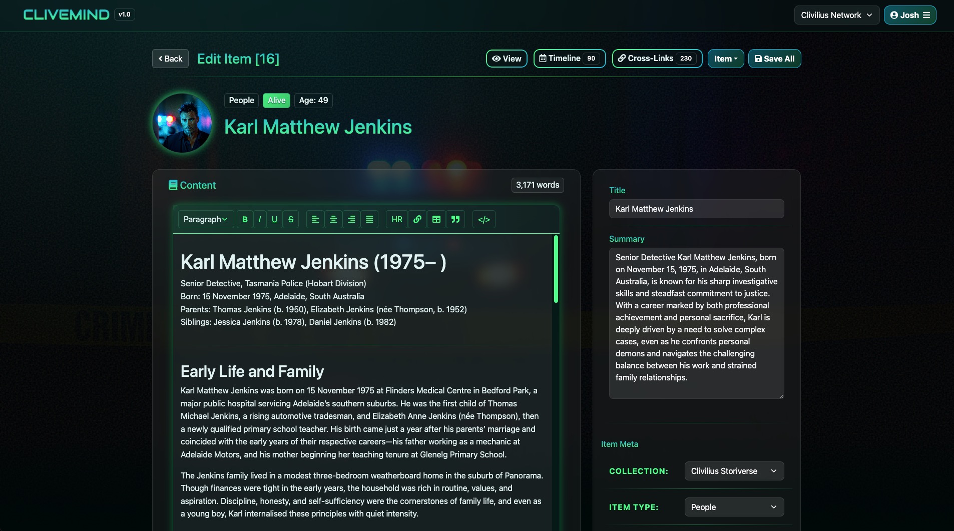 CliveMind lets you link chapters, people, places, timelines and knowledge into living networks.
